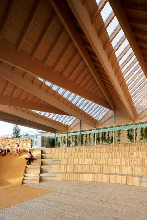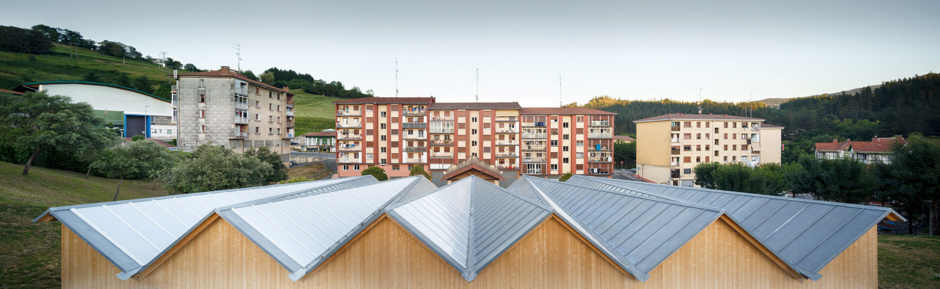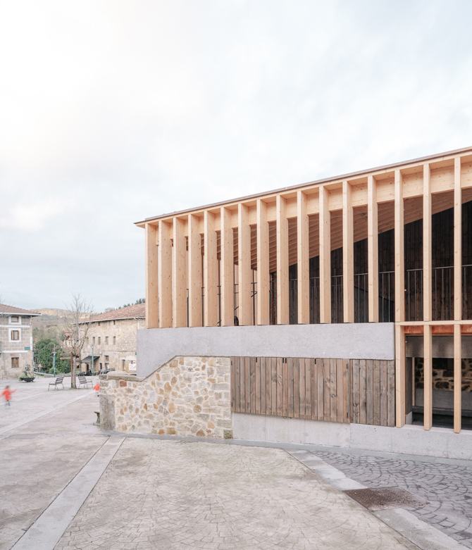 Behark recoge una materialidad reconocible para responder con un edificio público donde el pórtico desaparece en un entramado de madera que relaciona el cobijo con la “herriko plaza”, la plaza del pueblo y su paisaje tradicional, agitado en este caso. Behark acepta, sin complejos, la materialidad de cercanía, piedra y madera, para construir un espacio que ofrece una nueva manera de pensar el paisaje rural-urbano edificado.
