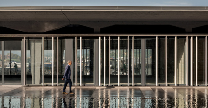 En las partes más permeables del edificio, la cerámica se transforma en una celosía, que mantiene la continuidad del color y de la escala de las piezas. Mediante este mecanismo sencillo del triangulo asimétrico, se introduce una variabilidad que permite la lectura individual de cada una de las piezas. Unidad y conjunto similar al de las cajas de madera que se apilaban allí. Además, el movimiento del sol, los cambios de la luz y las estaciones, así como el reflejo de la lluvia, otorgan a la fachada un aspecto cambiante. Lleno de matices y brillos, al igual que la superficie del mar contra la que el edificio se sitúa.