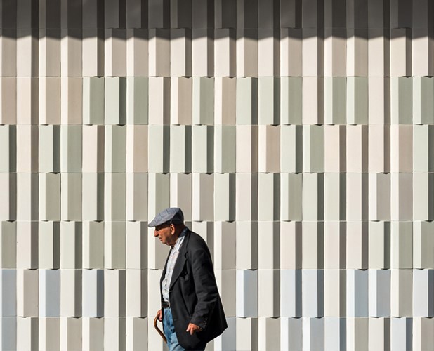 La cerámica se trata aquí como una pieza tridimensional, que vibra en seis blancos sutilmente diferentes, siendo algunas de las piezas mates y otras con acabado en brillo. Por un lado estableciendo esa relación con esas dos arquitecturas cercanas, la popular y la culta, representadas en el contexto del puerto de la ciudad, y por otro, lado busca un efecto fenomenológico que haga que la fachada funcione como un elemento independiente de la cubierta y la estructura originales.