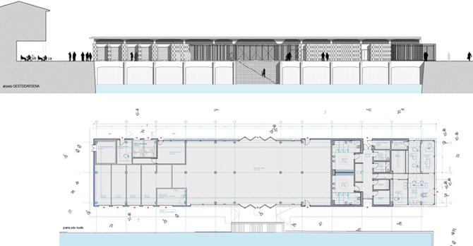 El proyecto, finalizado en el año 2019, se plantea casi como un ejercicio de arqueología que trata de retirar, eliminar aquellas partes que desdibujaban el proyecto original, devolviendo en la medida de lo posible el protagonismo del edificio a la estructura original y a su gran cubierta. Para albergar el programa propuesto en el concurso se sitúan al abrigo de la cubierta una serie de volúmenes que establecen un eco con las cajas de madera apiladas que inicialmente ocupaban aquel lugar, de forma fragmentada. En ese sentido el proyecto puede resumirse como el sumatorio de dos operaciones, una de limpieza y otra de construcción de unos cierres, de unas nuevas fachadas. Estas nuevas fachadas se plantean como una continuidad con las lógicas del lugar y el contexto, pero desde una óptica netamente contemporánea. En ese sentido se recurre a la cerámica, un material ampliamente usado en las fachadas de las casas de pescadores que asoman al puerto, por su capacidad de soportar el salitre y la dureza del mar cantábrico. Y por otro lado, se recurre al color blanco, un color icónico representado en el edificio de Real Club Náutico a escasos 100 m de distancia, y tal vez la obra del movimiento moderno más emblemática construida en España.