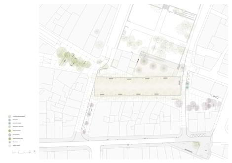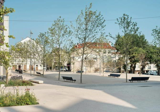 La introducción de los árboles en el espacio público contribuye a mejorar la calidad del aire y a atenuar las emisiones de gases de efecto invernadero producidos por los vehículos. Además, mejora la percepción del espacio urbano, creando espacios de sombra y calma, propicios para la reunión social, el paseo y el juego. Se eligen en general especies caducifolias de hoja mediana que con el cambio de coloración de la hoja muestran el paso de las estaciones y los ciclos de la naturaleza en el interior de la ciudad. El espacio central de la plaza se pavimenta con un suelo filtrante semiduro de áridos compactados, muy adecuado para este tipo de espacios urbanos. Este suelo se confina en su perímetro con bandas de granito silvestre, y permite el paso de la lluvia a su través, reduciendo la cantidad de agua susceptible de ser llevada a la red de saneamiento. Además, el agua de lluvia de las zonas circundantes es conducida hasta franjas plantadas con vegetación donde se filtra al terreno. Así se gestiona el agua de una manera más sostenible y se consigue un ambiente urbano naturalizado.