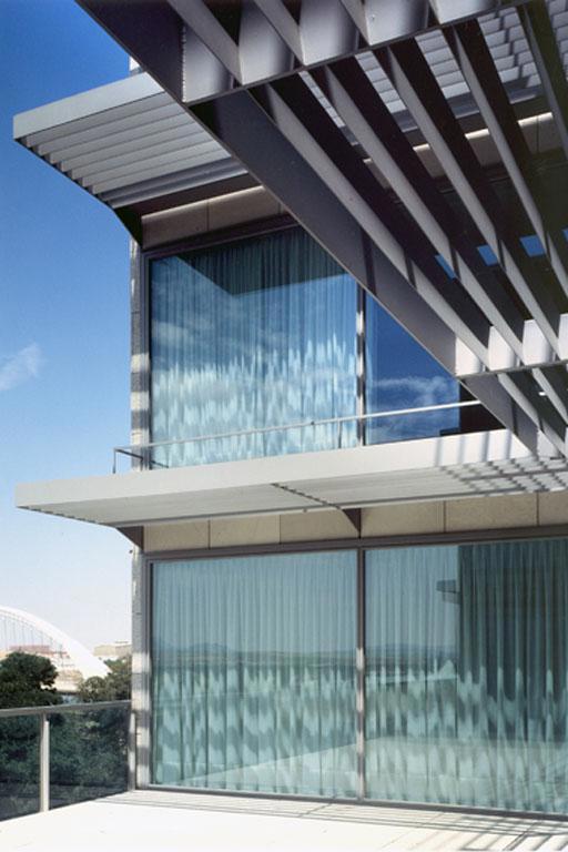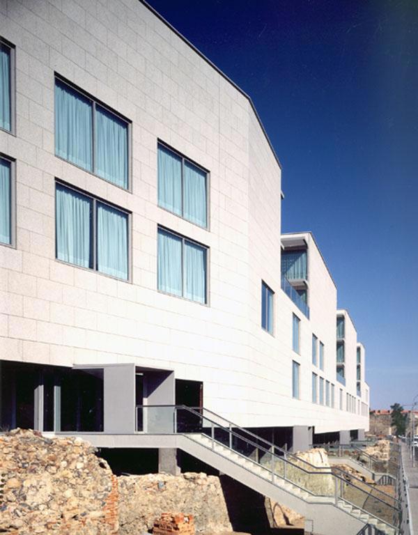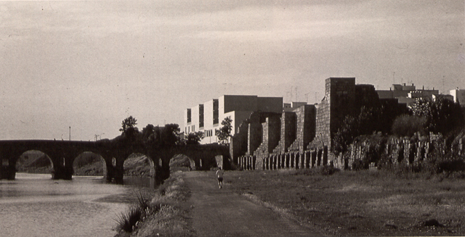 La apariencia abstracta y lineal proporciona la ambigüedad precisa entre ambos enclaves urbanos en sus extremos. El edificio domina una gran porción de la ciudad desde el otro margen del río Guadiana, por lo que aun cuando el solar se extiende longitudinalmente paralelo al río, el edificio se orienta transversalmente para responder a esa visión distante.