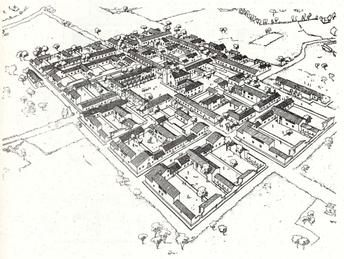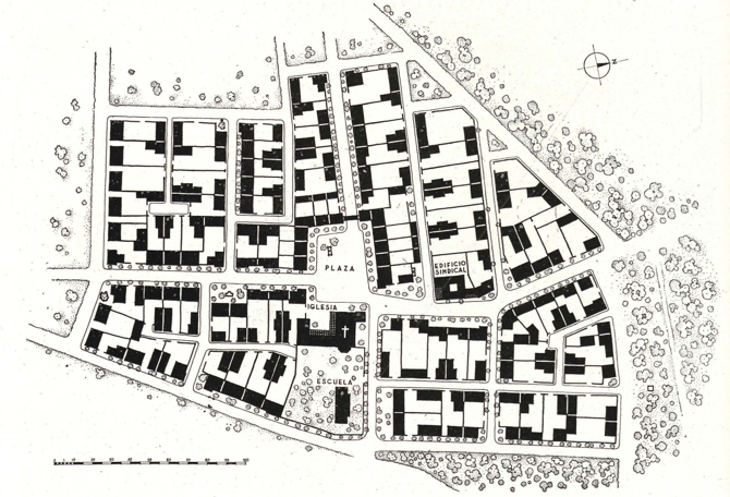 El criterio urbanístico adoptado es el de la creación de nuevos pueblos y núcleos con radios efectivos de acción inferiores a tres kilómetros; con arreglo al mismo se prevé la construcción de los siguientes : Gimenells, Such, Coscollar, Raimat y Montagut, de los cuales el primero está ya terminándose y el segundo en período de construcción. El pueblo de Gimenells se ha situado en el cruce de los caminos que unen Valmanya con Almacellas, y Gimendls con Zaidin. Se ha tenido en cuenta en su trazado los pequeños accidentes naturales que en el lugar de emplazamiento han concurrido. No existía el menor desnivel aprovechable desde el punto de vista estético: el solar era completamente llano. No existía tampoco ni un solo árbol que por su corpulencia y belleza debiera ser respetado. Se ha tenido presente solamente el trazado de las calles y el perímetro exterior del pueblo, el sistema de acequias, y desagües que en la actualidad existen.