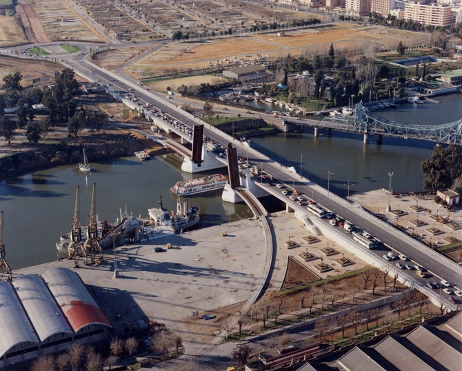 Nuestro trabajo en este puente se inició con el planeamiento del nuevo cruce sobre el canal de Alfonso XIII de la ronda urbana de Sevilla, y del nuevo acceso ferroviario a la margen derecha del puerto, que estudiamos para el Plan General de Sevilla. Posteriormente hicimos el proyecto del puente para el Ayuntamiento de Sevilla, y fue construido por la Dirección General de Puertos del MOPT.