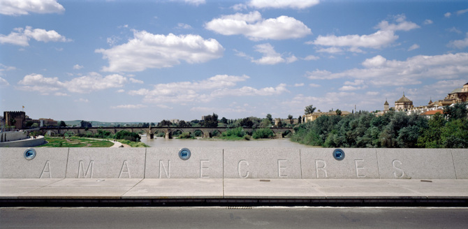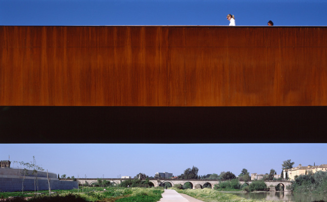 Decidimos emplear un discurso formal escueto, de pocos gestos. Advertir el paso del tiempo, percibir la panorámica patrimonial, no distraer el transcurso del Guadalquivir. Valorar el Puente romano, dibujar una línea bajo las lejanas gradas de la Mezquita, abandonar en una nueva isla las imágenes del recuerdo fluvial. El cauce como paisaje agreste, claramente “no urbano”, el fondo de un barranco. Sus márgenes, terrazas naturales, praderas y plataformas, discurren paralelas al lecho. La existencia de una vegetación que nadie ha plantado. El puente añade un nuevo campo de visión, transmuta de alguna manera el paisaje junto a la Mezquita de Córdoba. Acota un ámbito sobre el Guadalquivir definido por el Puente romano, la arboleda ribereña que oculta un viejo muro de piedra, el nuevo muro de defensa de Miraflores y nuestro Puente.