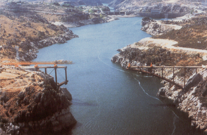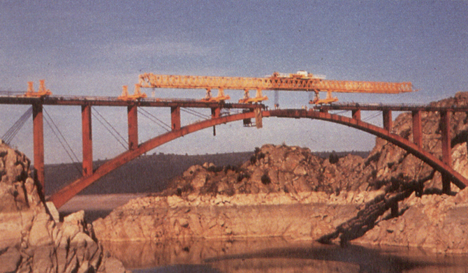 El procedimiento de construcción consistió en avanzar en voladizo añadiendo sucesivamente piezas metálicas, ejecutando una viga de celosía de gran canto que se completó con diagonales temporales de cables de acero. La estabilidad de todo el conjunto se logra atirantándolo contra la roca de las laderas.