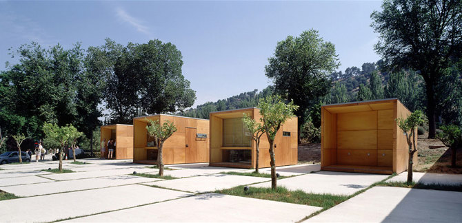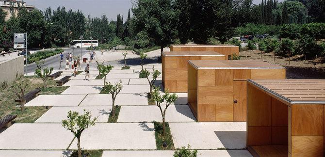 -El proyecto se formaliza en cuatro cajas de madera de tamaño diferente colocadas entre los árboles y sobre un pavimento surcado por canaletas y arriates que permiten extender el arbolado por toda la zona.