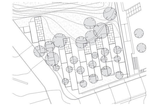 -Entender la intervención como una colonización suave del bosque, en la que pavimentos, casetas y bancos se entremezclan con el arbolado.