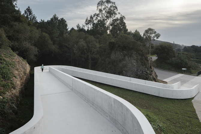 La rampa recupera la idea de camino y sustituye a la escalera aprovechando los cortes dados al talud. Su pendiente suave permite la parada y observación de la ciudad que va apareciendo en el recorrido. Las curvas, con sus giros y recodos, se utilizan como espacios de transición en los que se produce el cambio hacia lo urbano, pero también el recuerdo de la naturaleza que se va dejando atrás. En ese sentido, el sinuoso recorrido de 111 m de largo y 2,5 m de ancho, además de la mejora funcional, juega un papel que registra para el caminante un cambio de tiempo (llegada) y espacio (entre el monte y la ciudad).