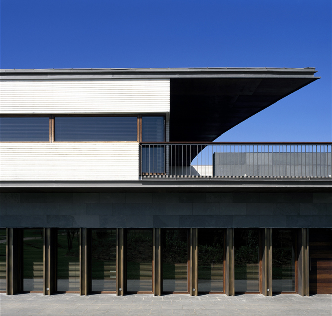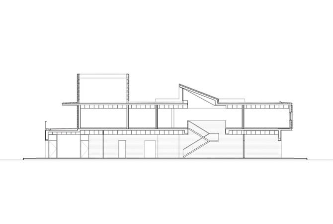 El programa del edificio central de la casa-club, basándose en un estudio minucioso de la topografía, se desarrolla a dos niveles, enterrando la zona de servicio (depósito y área de almacén) y concentrando en el centro la zona técnica y de instalaciones, no visible desde el exterior; con este criterio toda la fachada disfruta de la vista sobre el paisaje.