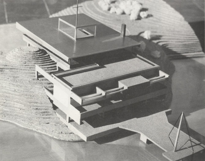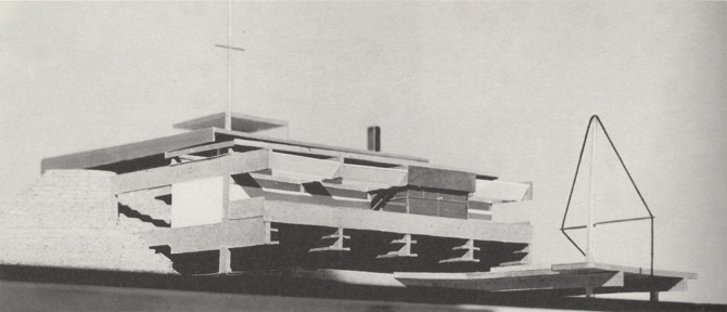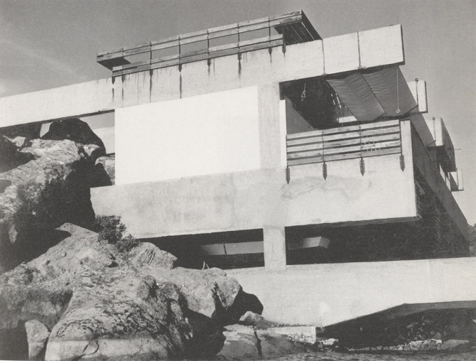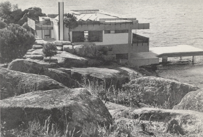 Mediante los importantes vuelos de los porticados (con su carácter fuertemente geométrico, casi neoplasticista, de grandes planos bidimensionales, y sus sombras arrojadas) se acentúan expresivamente las superficies de hormigón y el enfoscado y pintado de algunos cerramientos, que puede dar una imagen ciertamente brutalista, pero que contrasta magníficamente con la tranquila lámina de agua y con las formas redondeadas de las rocas berroqueñas donde se asienta el edificio.
