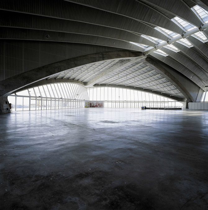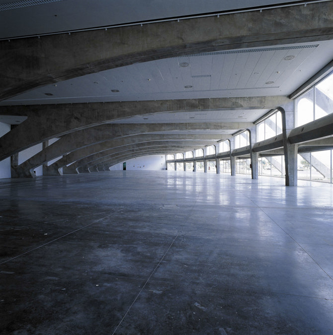El espacio principal es un forjado continuo de una sola planta, de planta curva, que se extiende hacia el exterior por debajo de una zona cubierta para crear una gran plaza: un espacio polivalente e irregular de 12.000 m2 frente al pabellón principal.