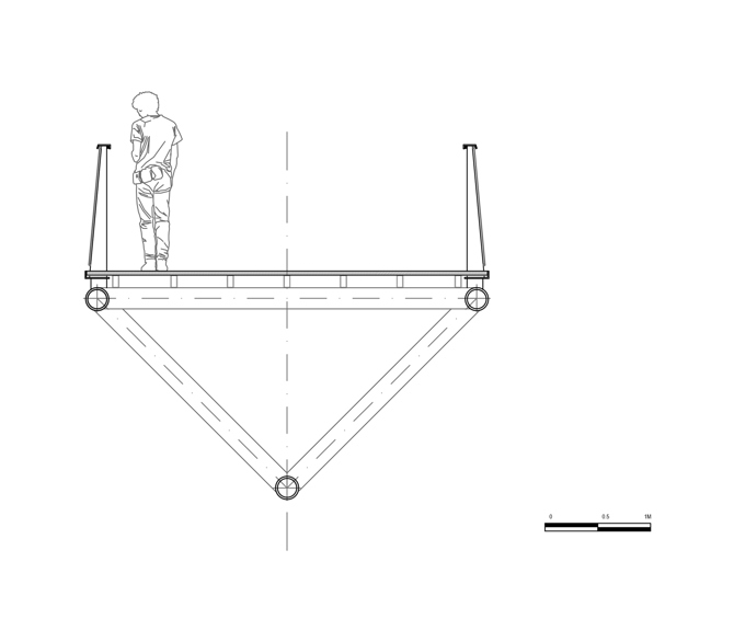 En el ámbito inferior encontramos otra pasarela, de menor tamaño, en torno a la cual se genera una plaza que sirve de pequeño pulmón al barrio y que acoge bajo ella unas plazas de aparcamiento cubiertas.