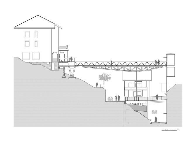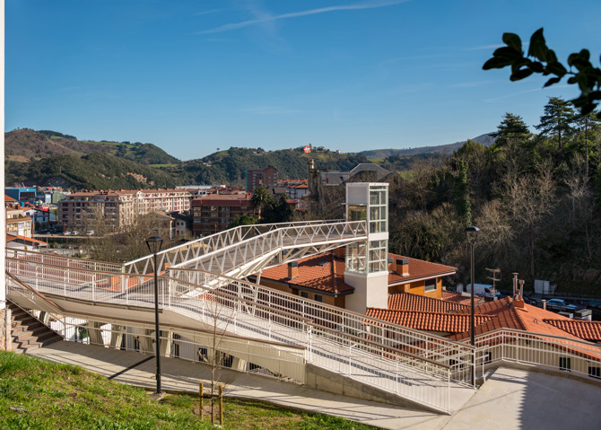 Para ello se proyectan dos pasarelas. La superior, de algo más de 28 metros, conecta el ascensor con las inmediaciones de la residencia de San Juan. A fin de garantizar la accesibilidad hasta el centro de mayores, esta se prolonga con otro tramo de unos 27 metros de longitud, que discurriendo sobre la ladera y con 4 metros de anchura, hace las veces de terraza y zona exterior de pausa.