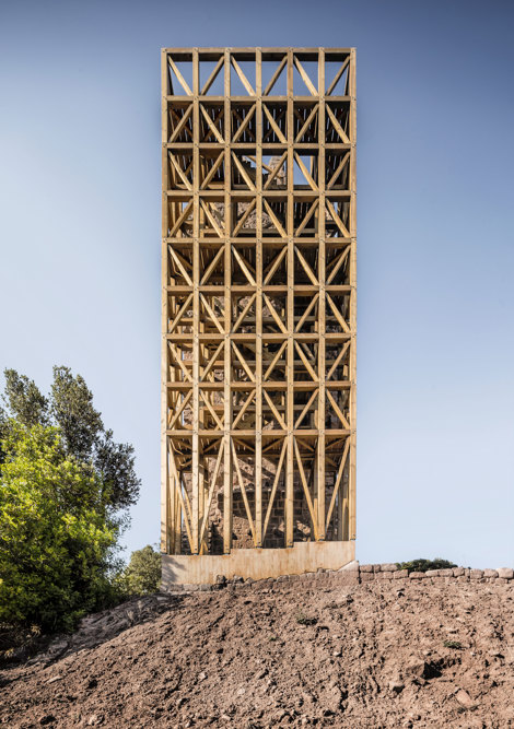 El refuerzo de la torre existente se plantea como una nueva estructura de madera formada por 18 perfiles de sección cuadrada de 14 x 14 cm que resigue el perímetro del muro de piedra y que permite compensar y recuperar la volumetría original