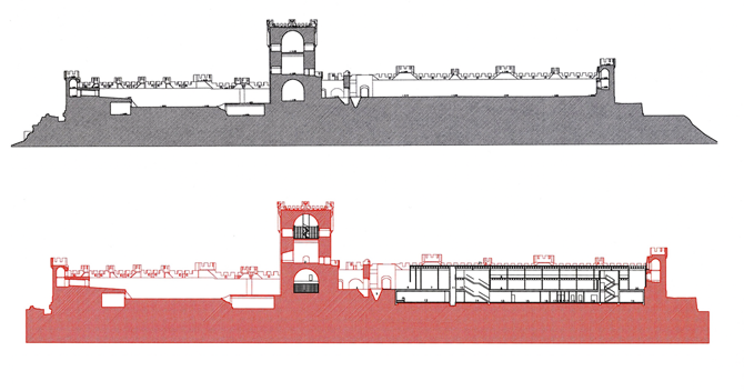 La rehabilitación consolida este buen estado con una intervención muy respetuosa con lo preexistente; el museo apenas toca los paramentos de piedra, se instala como una construcción exenta compuesta por pilares y vigas de acero y forjados de madera, materiales que establecen una clara diferenciación con los muros que desde el siglo XV conforman el patio del castillo. Además, la ubicación de este museo en el patio no rompe con la “tipología de patio abierto", ya que desde sus inicios este patio albergaba pabellones para soldados y caballerizas.