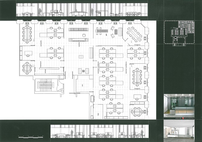 La implantación empieza a concebirse desde la entrada, un felpudo corporativo permite discernir el umbral de la actuación. La puerta tensiona el espacio existente, lo que nos permite desde un hall distribuidor, con el libro de firmas colgando en el centro, establecer el nexo entre las áreas de comerciales y el área de I + D. Todas las salas de reunión se alternan con vacíos, se ordenan en la piel exterior.