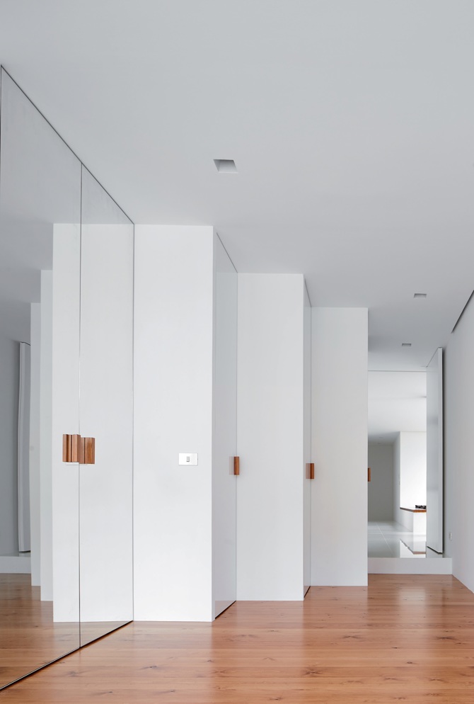 La geometría y ubicación estratégicas de las piezas de servicios, así como los sutiles juegos de altura en sección del interior, crean una serie de relaciones diagonales que, al igual que sucede en la fachada principal, van cosiendo los diferentes espacios de la casa, al tiempo que los matizan y definen, apoyándose además en la elección de la madera para el pavimento de aquellas áreas que requieren una mayor calidez.