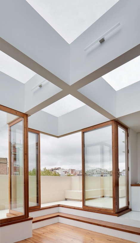 La intervención plantea una reorganización del espacio que persigue incorporar el exterior en la vivienda para dotarla de la iluminación y ventilación de la que carecía. Para ello, se maximizan los tamaños de las perforaciones, desdibujando así los límites del volumen inicial y convirtiendo la relación entre interior y exterior en el eje central de la propuesta. Las estancias de mayor privacidad se ubican en los extremos para liberar el área central, que se extiende hasta la terraza, como espacio de relación. En este punto, un gran lucernario y una fachada quebrada acristalada redefinen la idea de límite y permiten que la luz invada el interior; su reflejo sobre el pavimento porcelánico contribuye a que, incluso, penetre más allá, en las zonas más alejadas.