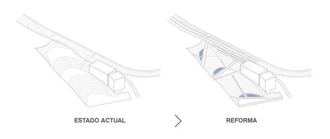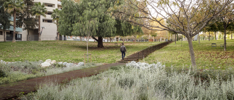 Conectar el parque: en el parque de Rosa Sensat se mejora la permeabilidad de los peatones a través del parque. Se crean tres nuevos ejes que conectan los tejidos urbanos de ambos laterales del parque y facilitan la continuidad de la ciudad sin modificar la topografía existente.