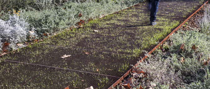 Renaturalizar el parque: se mejora la autosuficiencia hídrica de la vegetación con espacios de retención e infiltración de agua pluvial. Se incrementa la superficie de césped, se introducen nuevas zonas de arbustivas con color y alineaciones de arbolado que potencian los nuevos trazados del parque.