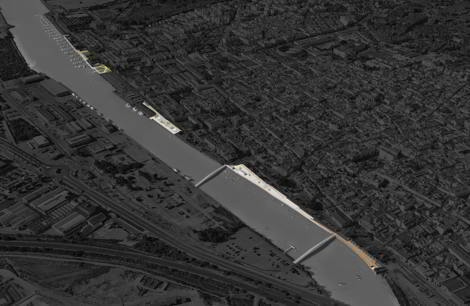 Para integrar definitivamente este espacio, el proyecto plantea sobre esta zona la eliminación de todas las barreras físicas y la redistribución de usos, creando un área abierta y neutra donde el protagonismo recae sobre el río y su integración con el diseño del histórico Parque Calderón. Eliminadas las barreras y reciclados los materiales valiosos del lugar, la integración se confía a dos elementos estratégicos: una rampa-mirador que conecta el paseo con el estribo del Puente de San Alejandro y los largos bancos de hormigón que resuelven la transición con el paseo histórico.