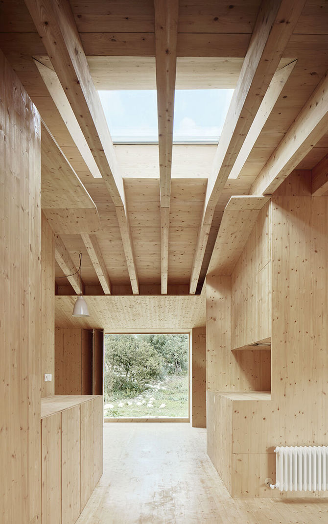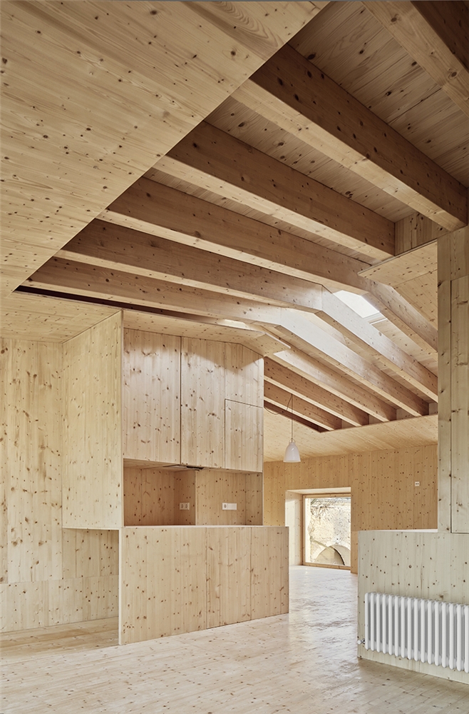 La intervención consiste en construir el interior de esta preexistencia y la cubierta manteniendo su aspecto exterior. Para evitar refuerzos estructurales e intervenciones más agresivas, se construye todo el interior en seco, con materiales ligeros, mayoritariamente madera. La nueva casa, dentro de la antigua casa, se presenta en realidad como un gran mueble protegido por la coraza de los gruesos muros de piedra.