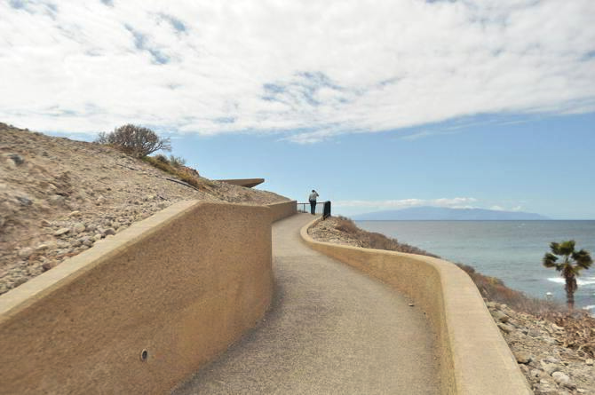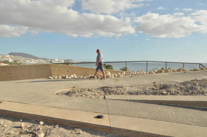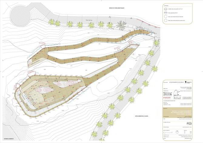 La primera intervención sobre el mirador consiste en aprovechar el mismo acceso existente transformando la escalera en una rampa accesible, sin excavar ni realizar nuevas modificaciones en el terreno natural. El nuevo sendero se adapta perfectamente a la topografía de la colina en un trazado serpenteante al 6%, en la que se insertan áreas de descanso, sombra, estancia y vistas. En este sentido el criterio principal en la construcción del sendero es ejecutarlo semienterrado en el terreno de manera que no se aprecie la intervención arquitectónica en la percepción paisajística de la montaña desde el litoral que rodea la colina. Por ello se utiliza el hormigón coloreado en ocre y la textura abujardada para facilitar la integración natural de los materiales, en colores y texturas similares a los que ofrece el propio terreno.