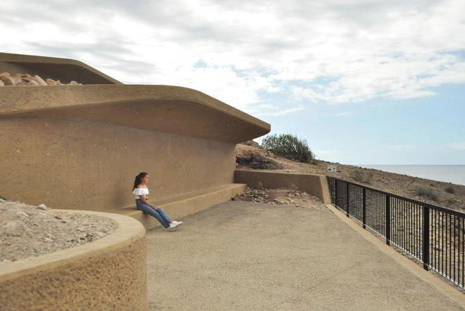 La propuesta de relación con el paisaje en la cumbre del mirador se realiza sin apenas barandillas, utilizando un espacio de transición a medio camino entre elementos de hormigón texturizados, un talud de roca natural y la generación de gradas para incorporar la estancia.