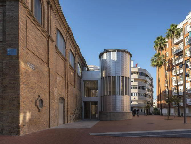 Restauración de la estructura de fundición original, cubierta de zinc sobre panel sandwich fonoabsorbente, fachada ventila de chapa de aluminio vibrada, restauración de la fábrica de ladrillo, mortero de cal, pavimento de granito