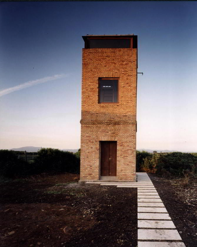 En el centro transformador la intervención es más dura. Los ornitólogos necesitan una visión de 360º para observar en sus desplazamientos las aves migratorias. Eliminamos, con la disculpa de que existe otro igual y cercano, y que la cubierta de este está agrietada, el casquete cilíndrico que la cubría y en su lugar, desmochando parte del muro para mantener la volumetría, situamos una linterna desde donde el estudioso de la naturaleza pasa tiempo observándola. Es como un faro pero sin luz, un faro de día.