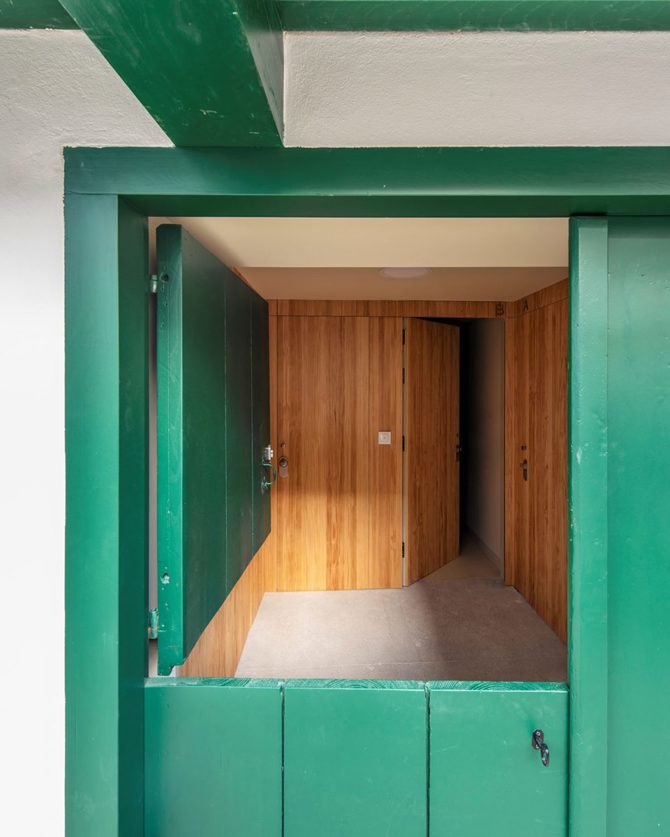 Se conservan las carpinterías exteriores existentes, reponiéndolas cuando se encuentran en mal estado, y se añaden unas nuevas, por el interior, también de madera, con hoja oculta y vidrio con cámara. La tabiquería se resuelve con paneles de cartón yeso, resistente al agua o al fuego según su posición y los pavimentos son flotantes de PVC.