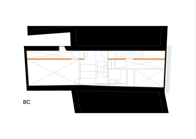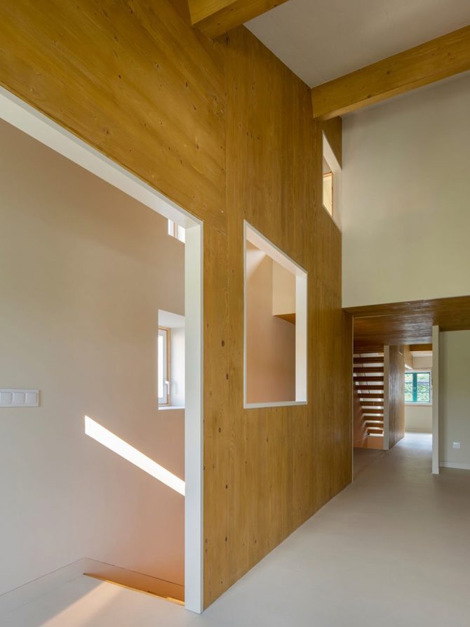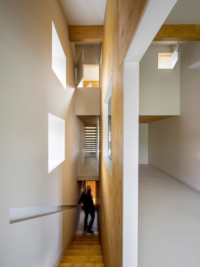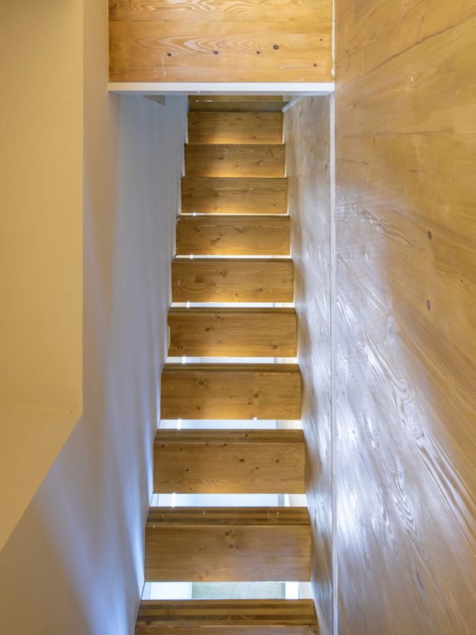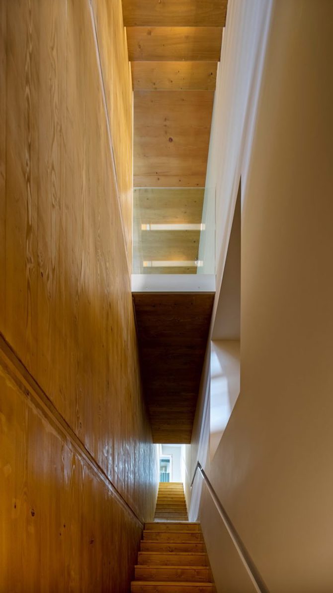 Un muro portante de madera contra laminada genera una división longitudinal intermedia, en toda la altura, que permite ubicar las escaleras o particularizar pequeños espacios que se incorporan a las diferentes estancias. Un patinillo de instalaciones, al que se adosan lavanderías, aseos y cocinas incorporadas a las estancias públicas, recorre verticalmente la zona central.