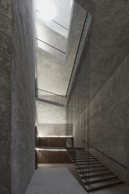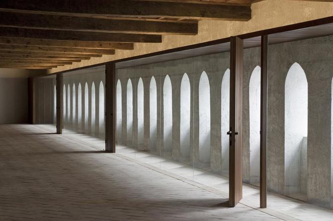Los materiales utilizados sirven para establecer una conexión entre el pasado y el presente, con superficies expuestas de piedra local, arcilla cocida, madera, piedra caliza y yeso. Esto no excluye, sin embargo, el uso de técnicas de construcción y materiales de refuerzo modernos, como el hormigón utilizado para los cimientos del edificio y el nuevo núcleo central que refuerza los muros interiores y soporta el lucernario y las nuevas cargas.