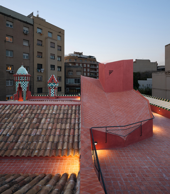 Hemos abordado la Casa Vicens con respeto y también con una sana e independiente distancia. Trabajando como un cirujano, hemos sustituido las partes que faltaban por nuevas incorporaciones a una personalidad destacada. Hay un momento en el proceso en el que lo importante es actuar con la mayor precisión y sin miedo. Diseñar una nueva escalera que se adapte a los códigos de construcción actuales y, al mismo tiempo, sustituir el fantasma de la original de Gaudí ha sido una aventura provocadora. Este importante elemento vertical, acompañado de un ascensor, ocupa el corazón central del edificio y relaciona la casa unifamiliar de tres niveles original de Gaudí de 1885 con el volumen añadido en 1925 para albergar a tres familias en tres plantas diferentes. Los rellanos conducen a las habitaciones originales de Vicens y el nuevo volumen de la escalera se hincha poligonalmente hacia los pisos del siglo XX. La escalera emerge en el tejado como un añadido geométrico nuevo y complementario al estilo morisco de la casa.