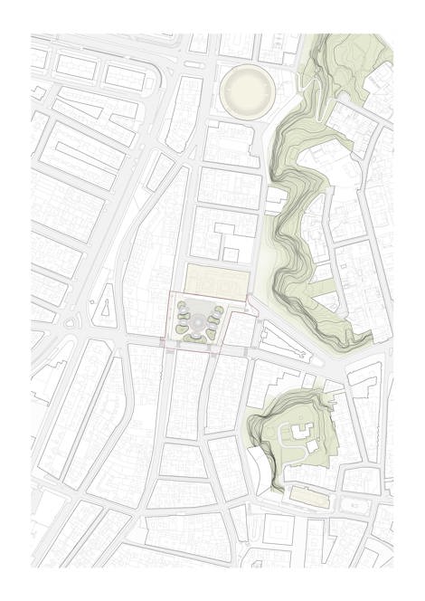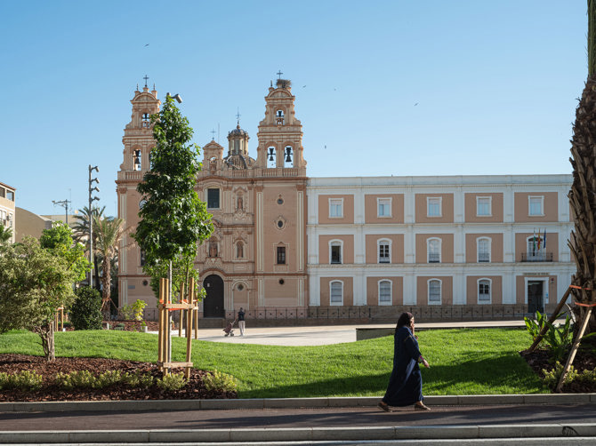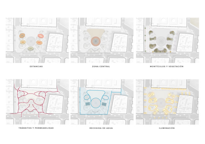 La Plaza de la Merced constituye un enclave urbano, viario, topográfico y cultural destacado en la ciudad, ya que se sitúa justo en el lugar en el que la topografía del sistema de cabezos de Huelva llega a contactar con la zona llana de la ciudad y sus antiguas marismas, colmatadas en épocas pasadas. Y así, las zonas verdes propuestas se presentan como montículos que recuerdan la peculiar topografía de la ciudad, mientras que todo un sistema de líneas y superficies drenantes de recogida de agua de lluvia, rememoran el carácter fluvial y marinero de la misma.