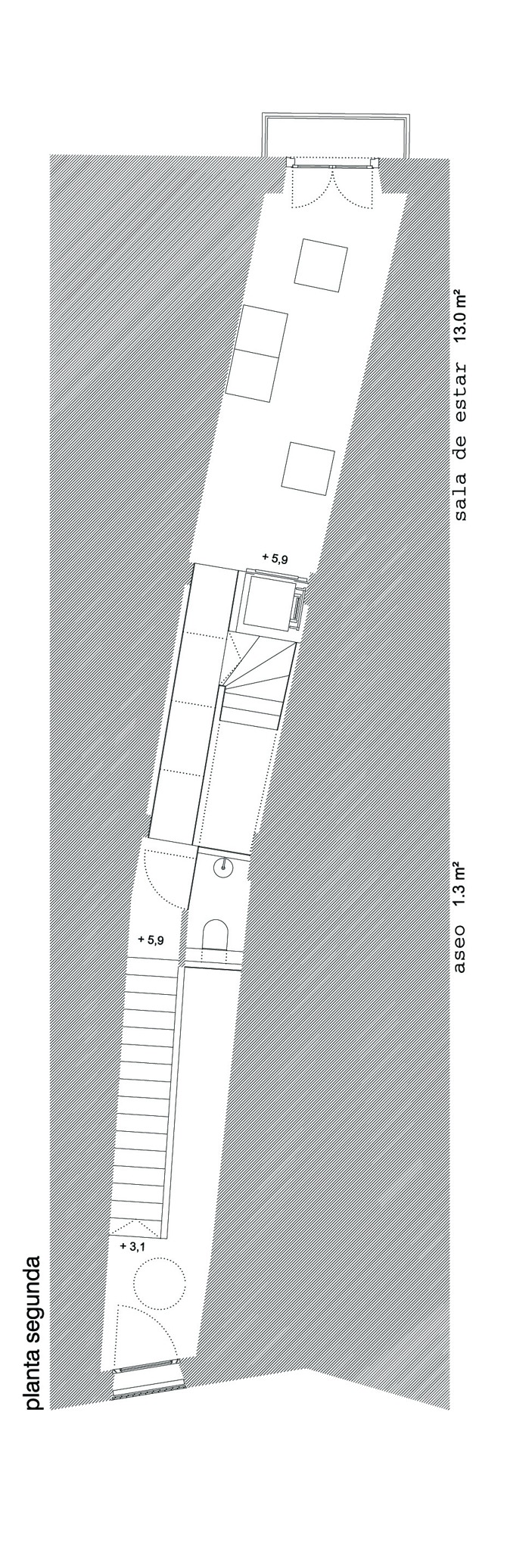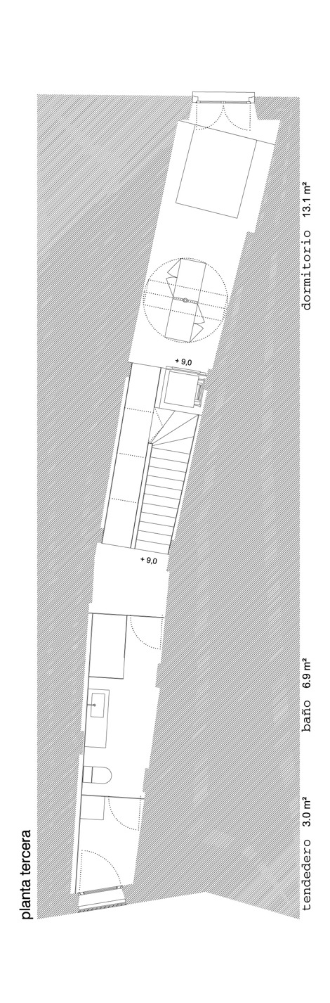 Se trata de la rehabilitación de un edificio entre medianeras definido por la trama de un casco antiguo de lotización medieval. La parcela se estira para iluminarse en dos calles paralelas y distantes entre sí en torno a 19 metros. La exigua anchura de 2,20 metros, la hace merecedora de poder clasificarse como las estrechas parcelas residuales de las ciudades japonesas que son conocidas como “lecho de anguila”.