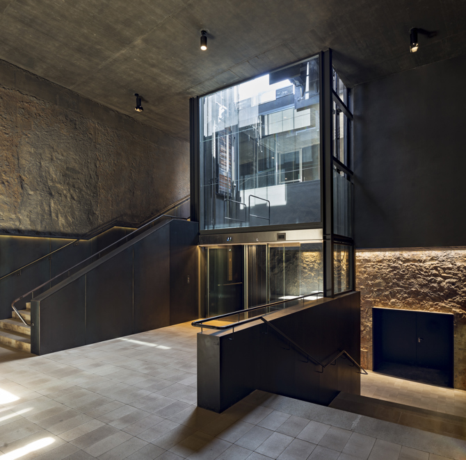 La caja de ascensores transparente permite la iluminación natural del espacio inferior y el volumen emerge en el espacio libre superior del Baluarte de Sant Carles en forma de edículo, que enfatiza las visuales hacia el mar. La restauración del baluarte recupera la visibilidad de la continuidad de los antiguos parapetos haciendo aparecer los restos arqueológicos. La restauración de los espacios alrededor del patio de armas y de la cubierta potencia el lugar como privilegiado mirador sobre la ciudad y el mar, y dotan al nuevo centro cultural de espacios para exposiciones, conferencias, cafetería y servicios. La formalización de los nuevos elementos, sin afectar la percepción de los espacios originarios, prioriza las soluciones constructivas que ponen en valor el patrimonio arquitectónico y son reversibles a lo largo del tiempo.