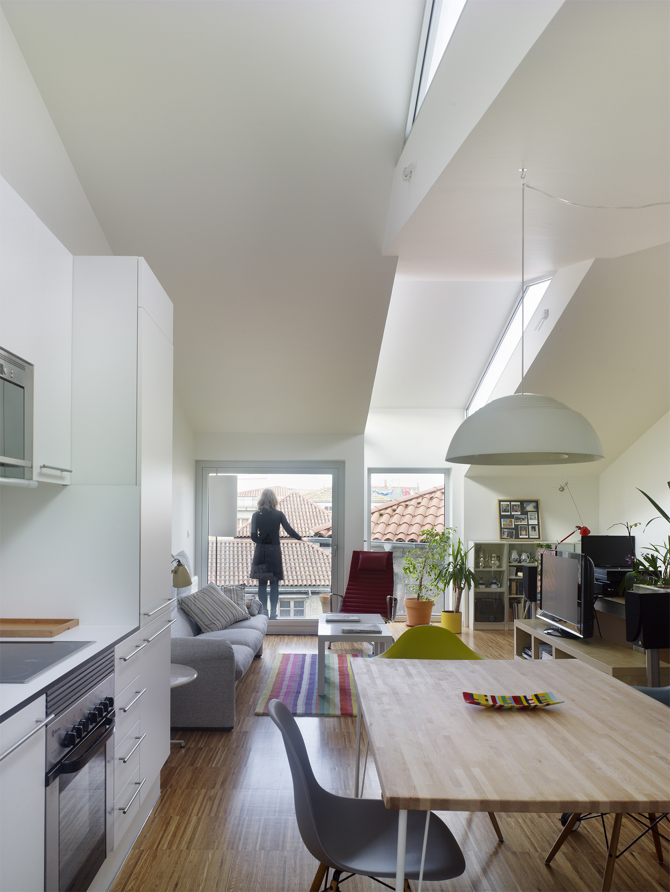 La solución planteada parte de la conservación de los muros medianeros y fachada del inmueble, así como de los elementos protegidos y genera una nueva ampliación en la última planta. El objetivo será buscar una buena transición entre el edificio colindante (con su añadido excesivo) y el resto de las cubiertas cercanas, mediante un mecanismo de fragmentación volumétrica. Para ello se parte de una configuración de cubierta tradicional a dos aguas a la cual se le aplican una serie de transformaciones geométricas que serán la base del proceso, y que consiste en fragmentar la cubierta en tres partes mediante un mecanismo de deslizamiento capaz de establecer las relaciones con el entorno deseadas, subiendo en altura allí donde es necesario mitigar la presencia de una medianera desafortunada, o bajando y replegándose en actitud de respeto allí donde aparece una cumbrera o un alero vecino. De manera que en los desfases de altura se producen unos saltos que aportan una nueva espacialidad a la última planta, además de resolver la entrada de luz; aspecto de importancia vital si tenemos en cuenta la situación escorada y desfavorable de la parcela en cuanto a condiciones de soleamiento. Se trata, en fin, de una estrategia flexible formalmente que permite una evolución del proyecto para adecuarse y adaptarse a todos los condicionantes existentes en el lugar.