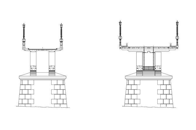 El puente de hormigón armado se refuerza y amplía añadiendo un arco central nuevo de hormigón armado para ampliar el tablero. Una intervención de gran complejidad estructural que apenas se percibe, quedando integrada en la arquitectura, pero que consigue actualizar el viaducto. Las pilas de soporte, los arcos y las vigas marcadas son de hormigón armado. Los elementos de barandilla y farolas se realizan con elementos prefabricados y de metal.