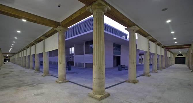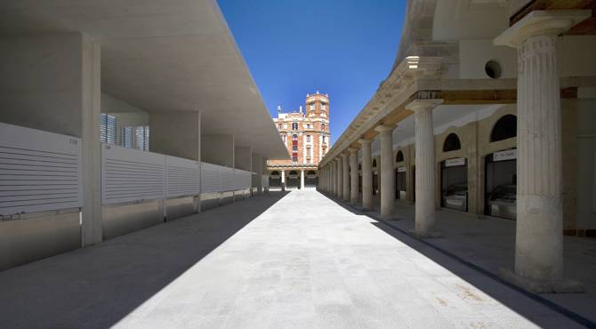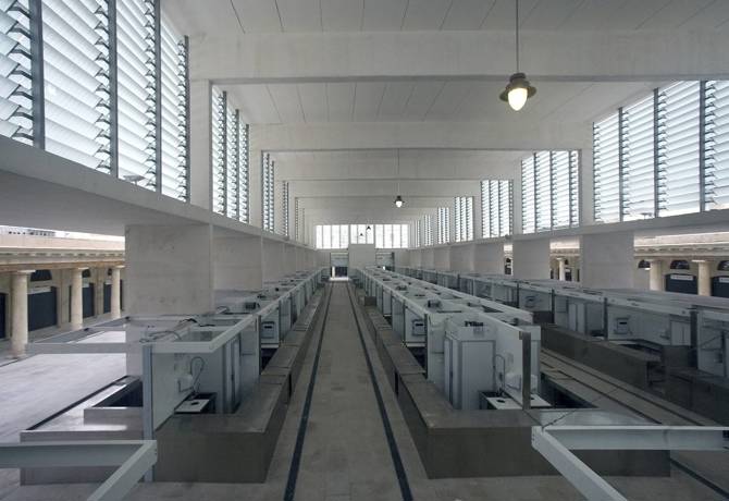 En este punto la decisión fue clara, nos quedamos con el perímetro y demolimos el centro. Debe resaltarse la falta de ventilación de la nave y la ausencia de luz natural que obligaba permanentemente a la utilización de luz artificial, con la consiguiente carga calorífica para personas y género. Se establecieron una serie de premisas obligadas. El edificio antiguo debía respirar y contemplarse en su totalidad. El nuevo, abierto, permeable y transparente, contaría con una similar capacidad al derruido. Un interior luminoso y ventilado ha permitido largas perspectivas y la percepción de columnata y arcos de acceso circundantes.