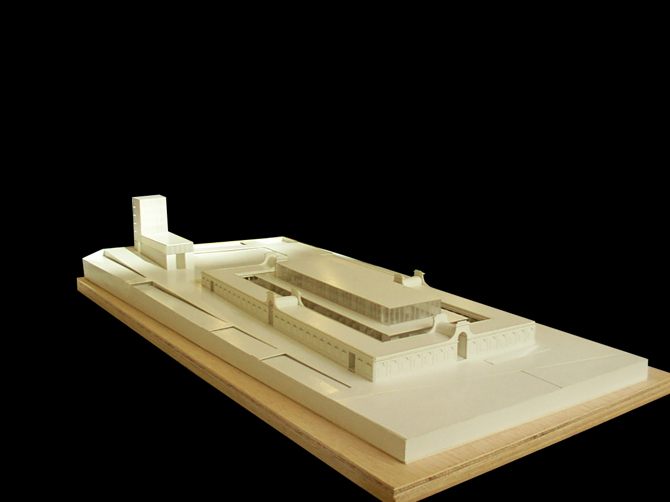 El nuevo edificio queda inscrito en el antiguo, con los márgenes suficientes para un fluido diálogo entre las dos arquitecturas. A semejanza de la galería cubierta, un amplio vuelo de hormigón protege a los puestos exteriores.