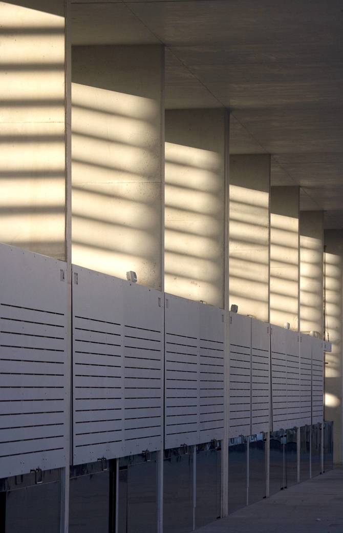 Se proyecta una estructura de pantallas de hormigón blanco que actúan como divisorias de los puestos y soportan el vuelo de 3,30 m. Una vez superado el vuelo, de la pantalla arrancan pilares de 60 x 30 cm., en el mismo tipo de hormigón, sobre los que apoyan jácenas de 130 x 30 cm, soportando la losa de cubierta. El cuerpo superior que destaca sobre la marquesina de borde se recubre con una piel de lamas de vidrio serigrafiado fijas a 45º y con una dimensión aproximada por unidad de 180 x 30 cm, montadas sobre una subestructura metálica tubular de acero inoxidable AISI 316.