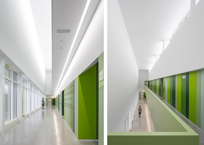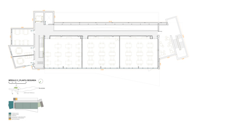 – Módulo C, frente a estas edificaciones, en la otra margen, existía otra de una altura. Se amplía en dos alturas, y se proyecta un juego de volúmenes y reflejos de los que participa la escalera y el resto de pequeñas piezas de conexiones introducidas.