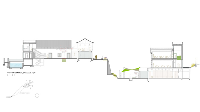 – Módulo B, pieza lineal en el fondo de la parcela, entre barrancos. Se reforma y conecta con un compás de acceso que lo une con el conjunto y el exterior de la parcela.