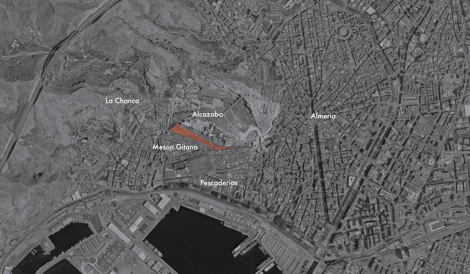 Nos propusieron restaurar la ladera sur de la Alcazaba de Almería, en Andalucía. Se trataba de un monte muy árido, vertical, con terrazas, muros de mampostería, cortes verticales de la montaña que dejan la roca vista y casas-cueva. En los años cincuenta las casas-cueva y las terrazas se adaptaron para albergar el hotel del Mesón Gitano, que posteriormente en los años setenta fue abandonado y derruido.