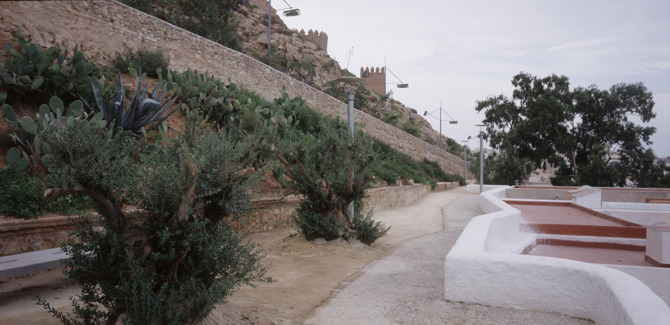 Cuando empezamos el proyecto, en el año 2003, la ladera era una escombrera. Nos propusimos restaurar la memoria del lugar y adecuar el lugar como acceso a la alcazaba y restablecer las conexiones con los barrios vecinos de Pescaderías y de La Chanca. Lo que queríamos era usar los elementos estructurales y los elementos vegetales que habían quedado después del naufragio de aquella desolación, usarlos como elementos del proyecto, queríamos que fueran los protagonistas del proyecto.