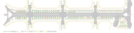 En segundo lugar, la nueva propuesta debe acoger los diferentes usos del espacio urbano haciendo posible su buena convivencia. Los 17 m de acera se organizan de manera que 6 m quedan libres para el recorrido peatonal y los 11 m restantes debajo de la zona arbolada conforman las zonas de estar (bancos, juegos infantiles y terrazas de bar).