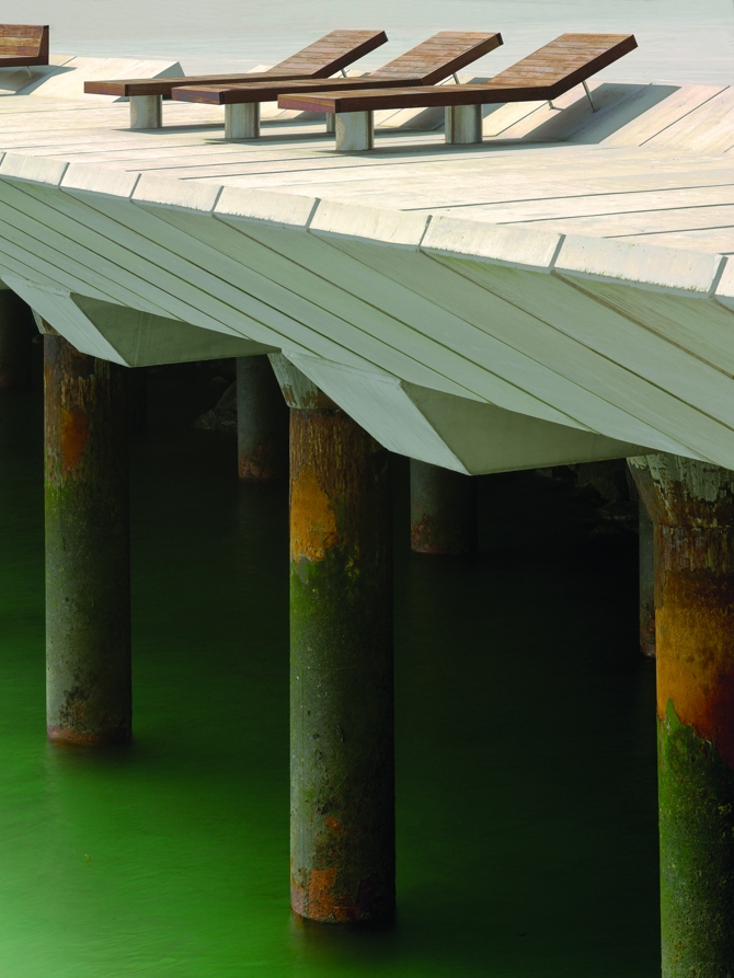 El espacio intermedio, la capa de camaleón camuflado que contempla, sin interferir, la actividad portuaria. Ya casi nadie se acuerda, pero todo el suelo de la dársena se ha puesto a la misma cota, la 6,10 del muelle de la compuerta, lo que ha mejorado la integración visual y espacial del lado este, además de enterrar bajo el metro de relleno la conducción de saneamiento que recorría, a la vista, la fachada marítima.