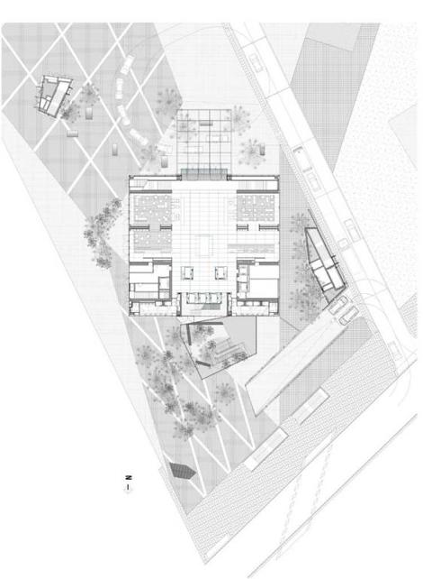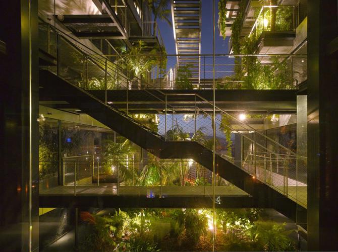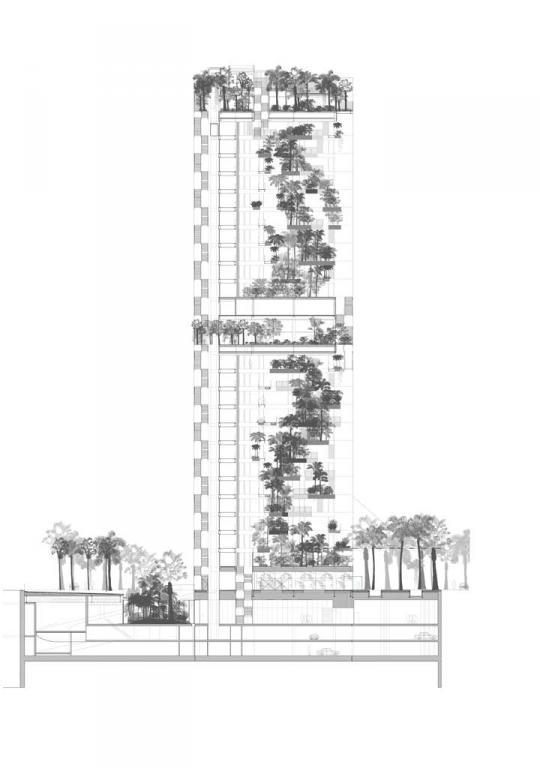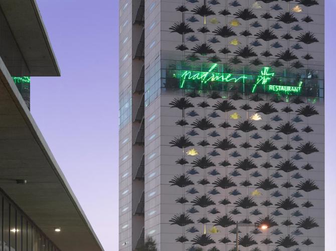 Hotel Catalonia es una invitación al lujo, enfatizado por una generosa marquesina vegetal. En toda la altura, dos logias exteriores unen ambos edificios. Acogen un exuberante paisaje vertical, bordeado por los pasillos de los dormitorios y atravesado por un juego “piranesiano” constituido por las terrazas y las escaleras. A media altura, un jardín rodea el edificio como un frío invernadero y filtra el sol. Detrás de las plantas, adivinamos el restaurante del hotel. En la cumbre, una corona de palmeras emerge de las terrazas de las suites, el fitness y la piscina. En el este, el sur y el oeste, las fachadas son luminosas, blancas, casi cegadoras. En el norte, la fachada es negra, mate. No hay ventanas, sino vanos que toman forma y se funden en motivos vegetales impresos sobre vidrio y esgrafiados en hormigón.